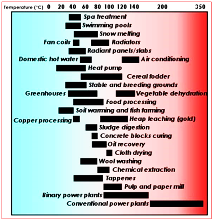 La produzione di elettricita' rappresenta la forma di utilizzazione piu' importante delle risorse geotermiche ad alta temperatura (›150°C). Le risorse geotermiche a temperature medio-basse (‹150°C) coinvolgono invece ampi settori di impiego. Il classico diagramma di Lindal (Lindal, B., 1973) mostra in maniera dettagliata il possibile utilizzo dei fluidi geotermici alle varie temperature: