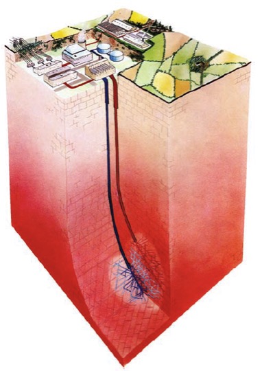 Rappresentazione schematica di un sistema geotermico artificiale (Rocce Calde Secche). Fonte immagine: https://www.treccani.it/export/sites/default/Portale/sito/altre_aree/Tecnologia_e_Scienze_applicate/enciclopedia/italiano_vol_3/595-610_ita.pdf |