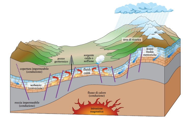 Rappresentazione schematica di un sistema geotermico Fonte immagine: https://www.treccani.it/export/sites/default/Portale/sito/altre_aree/Tecnologia_e_Scienze_applicate/enciclopedia/italiano_vol_3/595-610_ita.pdf