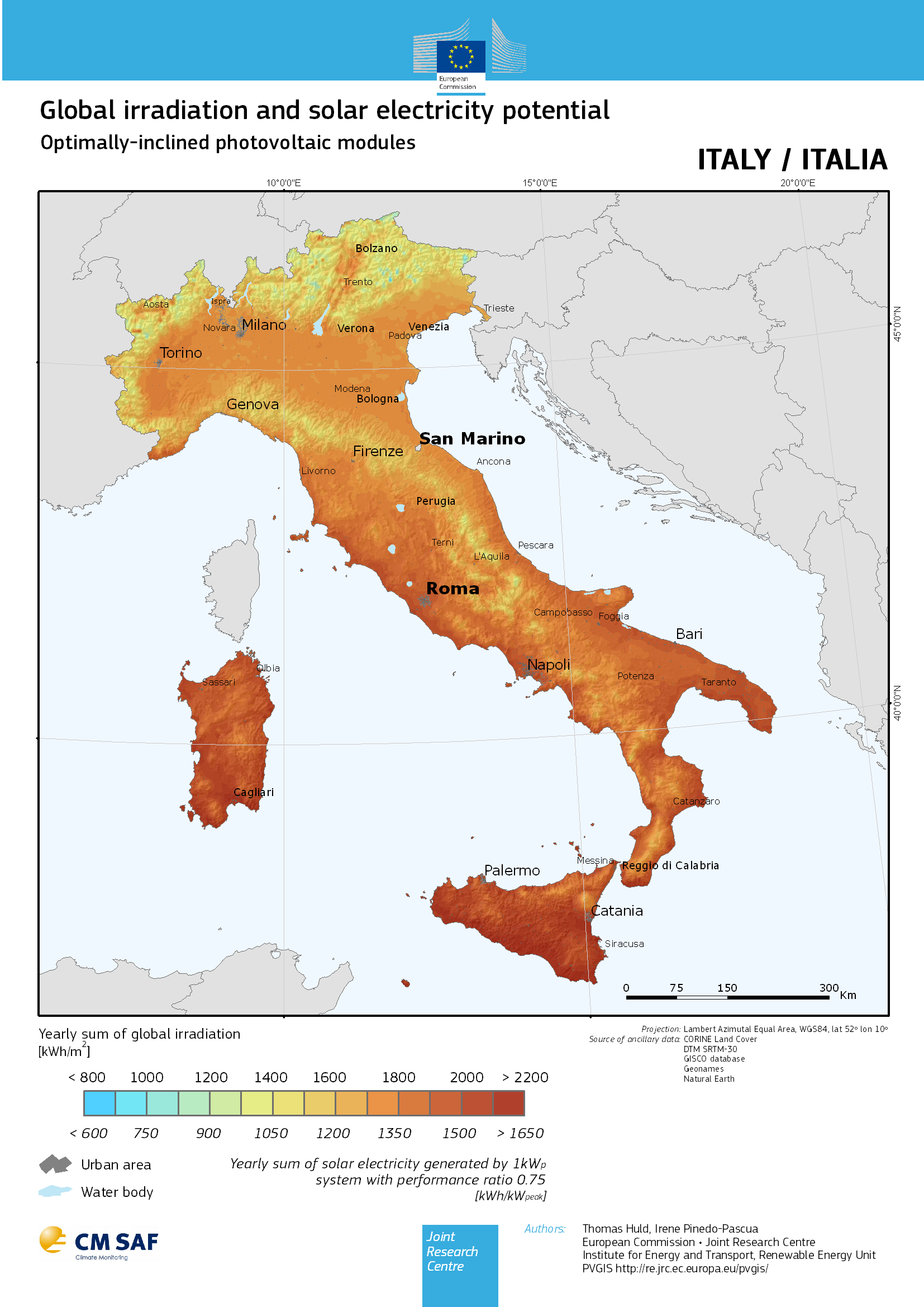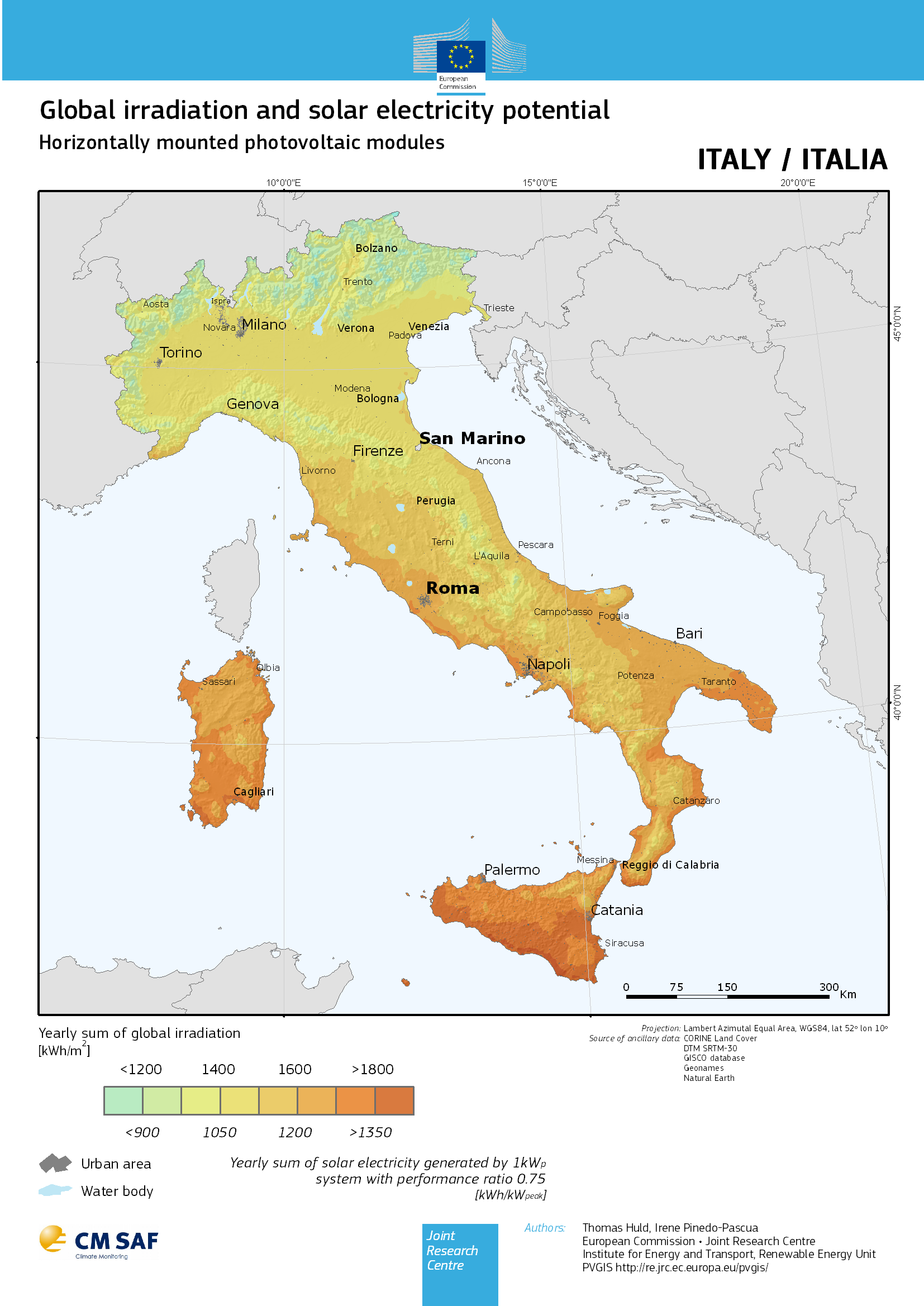 Bisogna notare che i valori forniti dalle mappe PVGIS sono valori effettivi, ossia al netto del calo di rendimento (tipico del 25%) di un impianto solare fotovoltaico. Cio' e' indicato nella descrizione della scala numerica, sottostante la barretta, dove si fa riferimento alla produzione annua in kWh/kWp di impianti solari fotovoltaici con rendimento del 75% (System with performance ratio 0.75). |