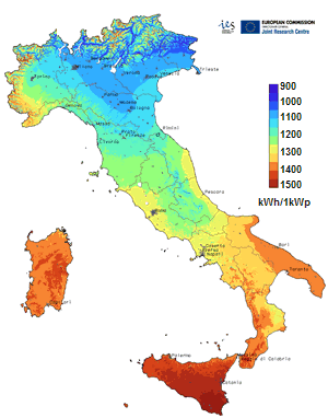 Si puo' affermare che in Italia la produzione di energia fotovoltaica per kWp di potenza puo' variare all'anno da un minimo di (900 - 1000) kWh ad un massimo di 1500 kWh, come indicato nella mappa solare d'Italia: